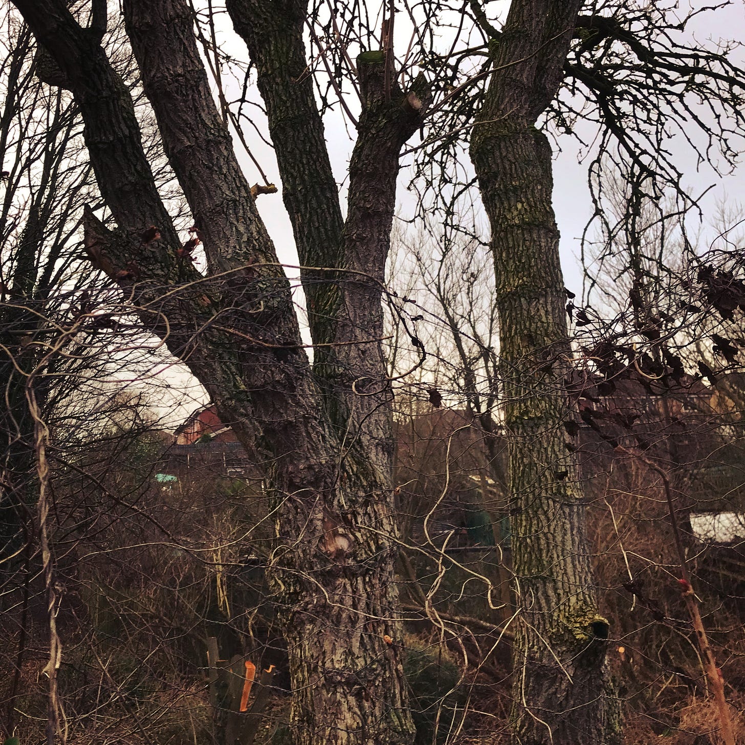 I have spent nine years or so in the company of an elder tree. It stands just outside our allotment plot, by the fence and spreading over it; you might say it looms there, or lours there. It’s big for an elder, maybe as much as ten metres tall, and old, though not ancient. When we first took on the plot the council had left for us a huge pile of rubbish in the north-east corner; the elder branches extended to and rested on this pile, and so this became one of my first allotment jobs: cut away the elder to reach and clear the rubbish.
